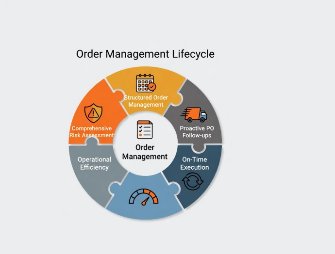 Structured order management ensuring proactive PO follow-ups, on-time execution, operational efficiency, and comprehensive potential risk assessment.